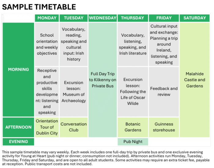 Our Young at Heart Programme is designed specifically for mature learners who wish to improve their English, discover Ireland’s vibrant history and culture, and connect with fellow students from around the world. The programme blends engaging classroom instruction with cultural excursions and social activities, all tailored to suit the interests and age group of the participants. Students will work with real-life, level-appropriate English materials and enjoy a variety of experiences, including a full-day trip in Ireland, an orientation tour, and a traditional pub evening.