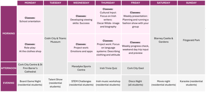 Social and Cultural Programme: Engaging activities include sports, cultural excursions, and activities, with two half-day excursions weekly and two full-day excursions. Evening activities daily for residential students and weekly for homestay students.