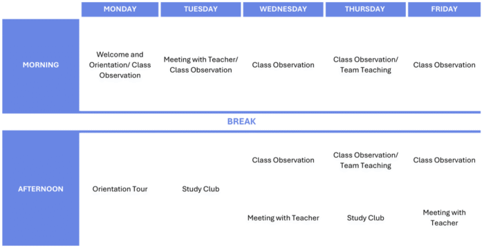 Schedule: 25 hours – 20 hours of Class Observation Monday to Friday from 09:00 to 13:15 + Meeting with Teacher Monday and Wednesday from 13:45 to 15:15 + Study Club Tuesday and Thursday from 14:30 to 15:30